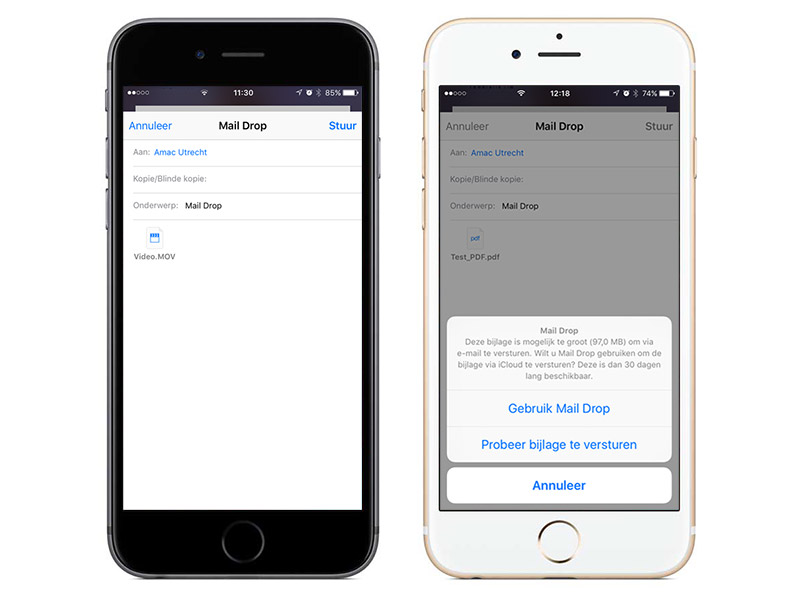 Het instellen van Mail Drop is eenvoudig. De enige voorwaarde is dat er een iCloud account op jouw iPhone is ingesteld. Als dat het geval is en je verstuurd een bericht waarvan de bijlage te groot is, krijg je automatisch een pop-up met daarin de keuze om de bijlage via Mail Drop te versturen.