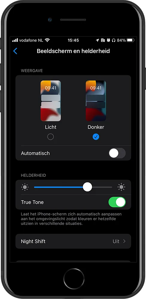 Om donkere modus aan te zetten ga je naar Instellingen > Scherm en helderheid. Hier heb je de keuze om de lichte- of donkere modus toe te passen. Simpel toch?