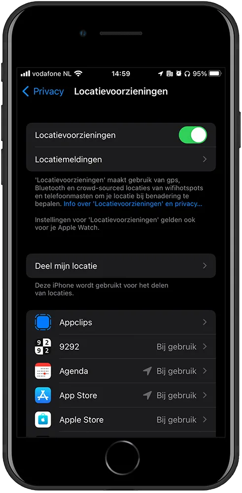 Om de locatievoorzieningen in jouw iPhone te vinden ga je naar Instellingen > Privacy. Zodra je op Privacy hebt gedrukt zijn de locatievoorzieningen bovenaan te vinden. Druk daarop om te zien hoe jouw apps daar gebruik van maken. Als je toelaat dat een app altijd jouw locatie kan zien zal dat meer batterij gebruiken, doordat die app steeds data verzamelt om te weten waar jij bent. Om dit te voorkomen kan je de app toelaten om jouw locatie alleen te zien bij het gebruik van die app, of je kan er voor kiezen om je locatie helemaal niet met die app te delen