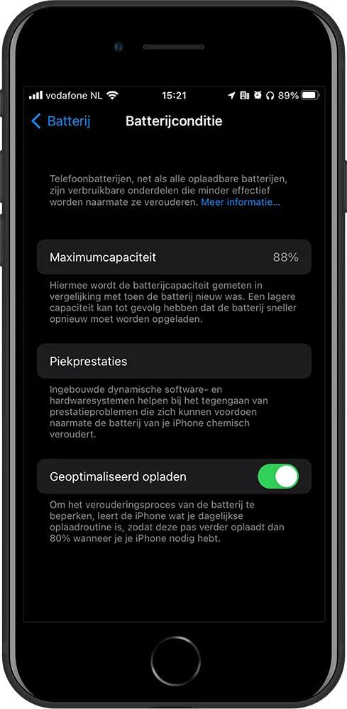 Om dit te vinden ga je naar Instellingen > Batterij. Druk daarna op Batterijconditie en onderaan de pagina kun je geoptimaliseerd laden aan of juist uit zetten.